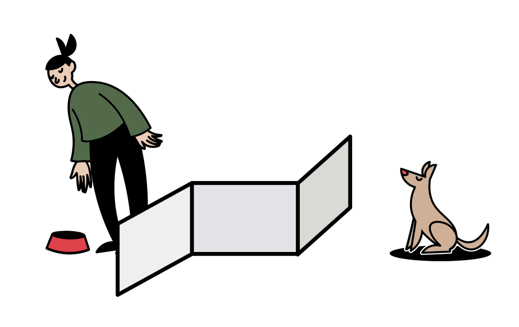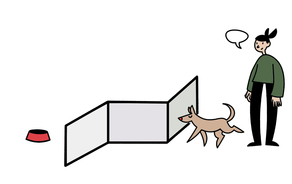 2. Vie ruokakuppi tai lelu sokkelon päähän niin, että koira seuraa toimintaasi tarkasti. Aloita erittäin helposta sokkelosta, josta koira pääsee ruokakupin luokse nopeasti ja helposti. Onnistumisten kautta koira saa itsevarmuutta ja oppii sokkelopelin idean, jolloin se jaksaa selvittää pidempiäkin ongelmanratkaisutehtäviä.
