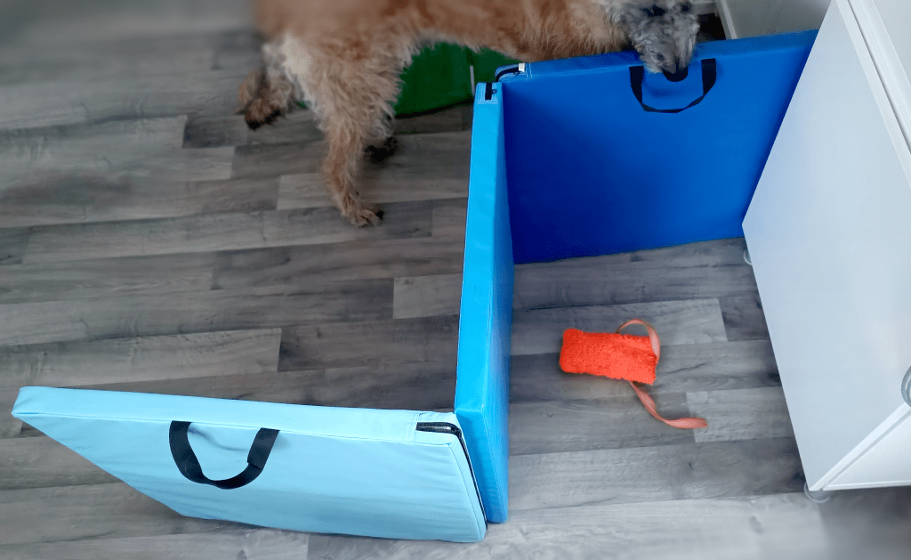- materiaalia, josta voi kasata turvallisen sokkelon. Sokkelon voi tehdä esimerkiksi isoista pahvilaatikoista, patjoista, kompostiverkosta tai pentuaidasta. Tue sokkelon seinät hyvin, jotta ne eivät heilu tai kaadu koiran liikkuessa.