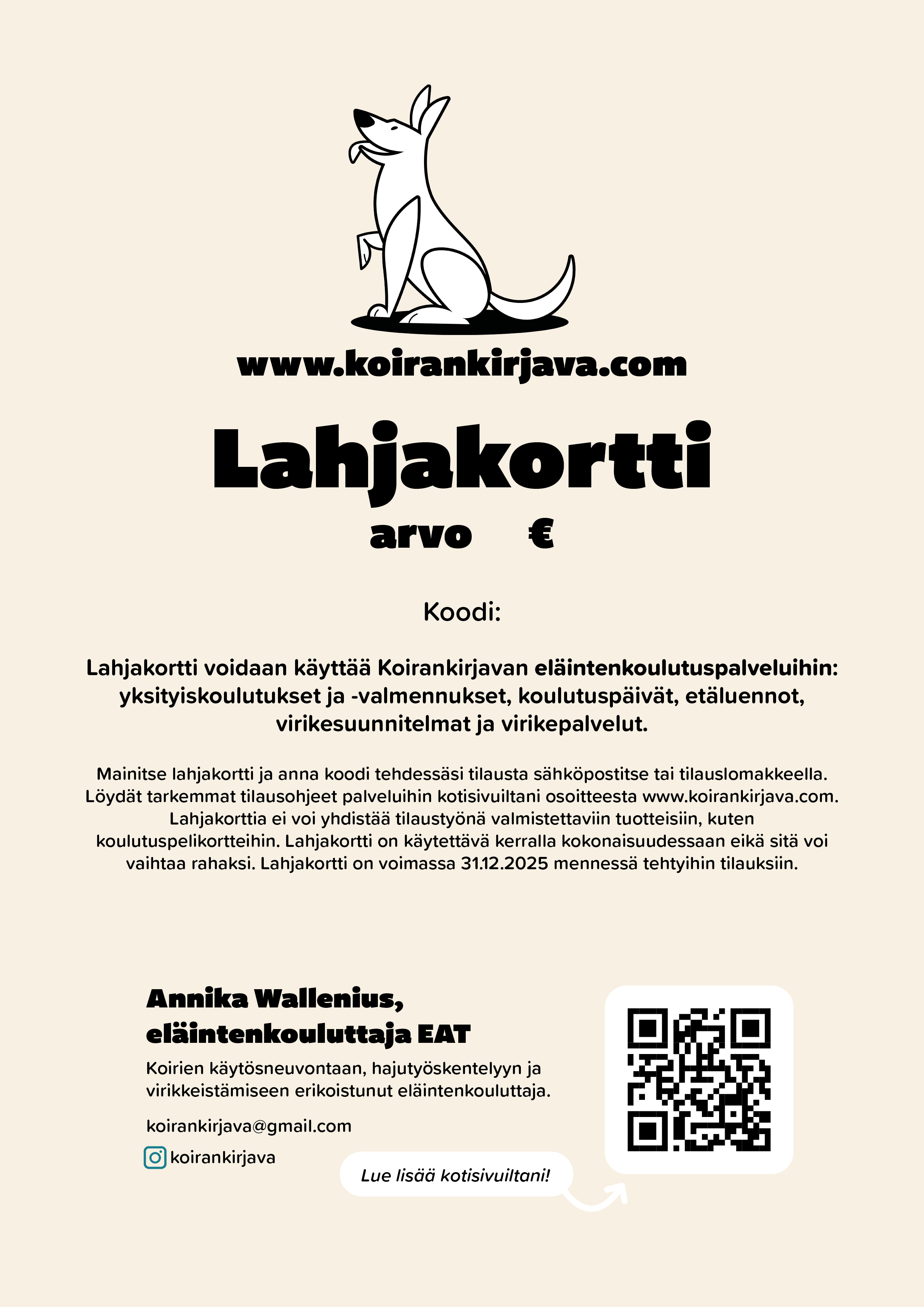 Tilaa lahjakortti sähköpostilla osoitteesta: koirankirjava@gmail.com