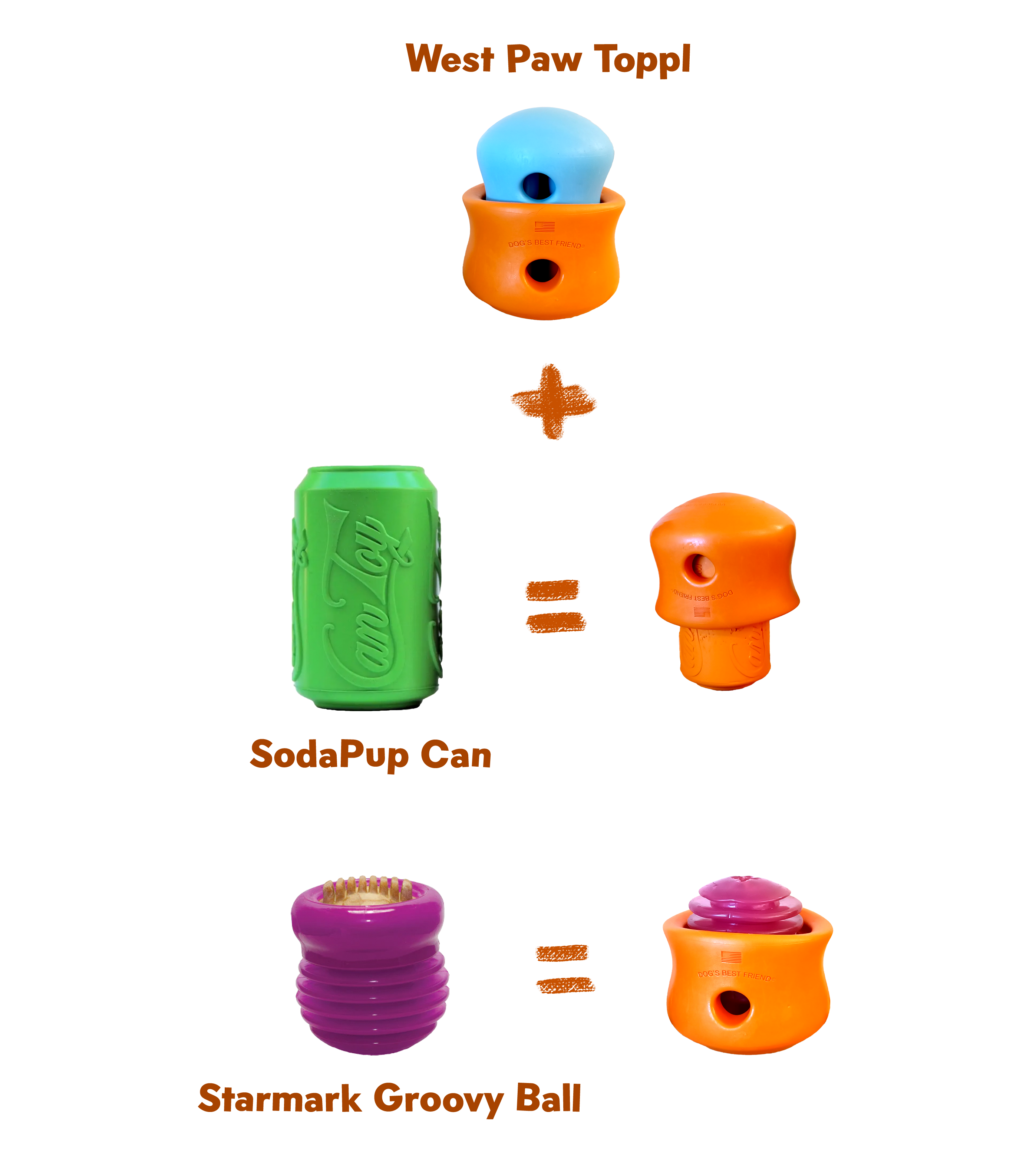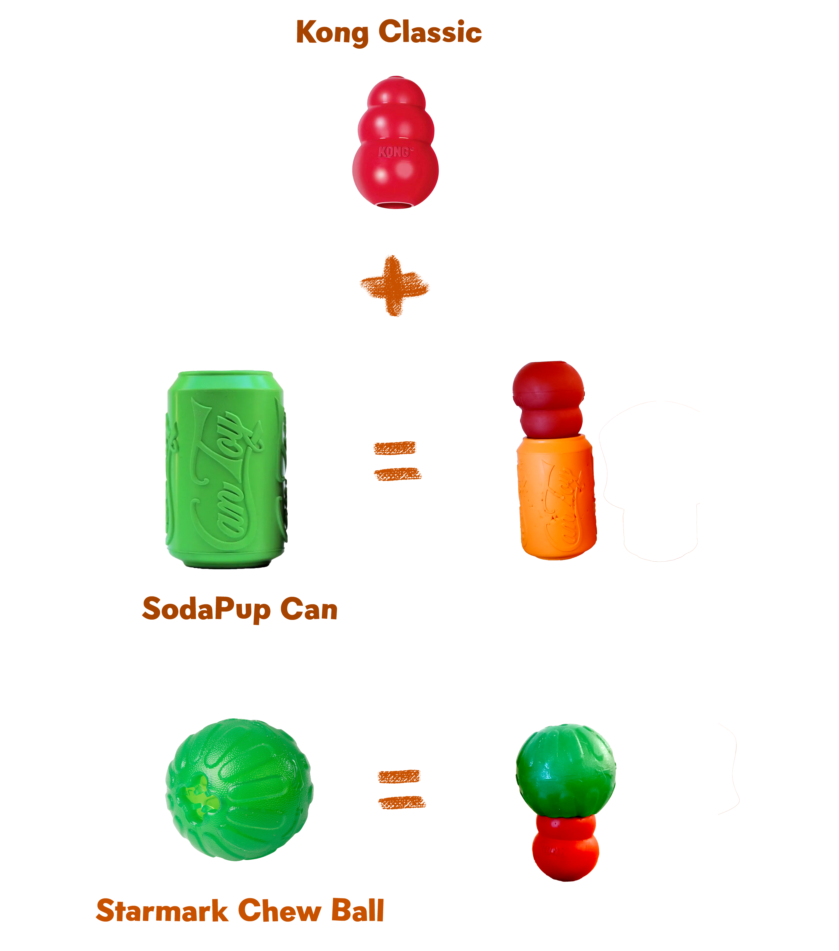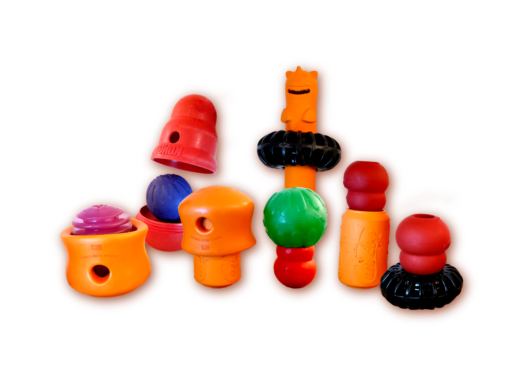 Olen muokannut alla olevista leluista SodaPup Can ja Starmark Chew Ball leluja leikkaamalla lelun suuaukkoa reilusti isommaksi. Tämän takia ne sopivat Toppl ja Kong leluihin loistavasti! Joitain kestävistä ja joustavista materiaaleista tehtyjen lelujen suuaukkoa voi leikata saksilla tai mattopuukolla isommaksi ilman, että lelun kestävyys kärsii liikaa.