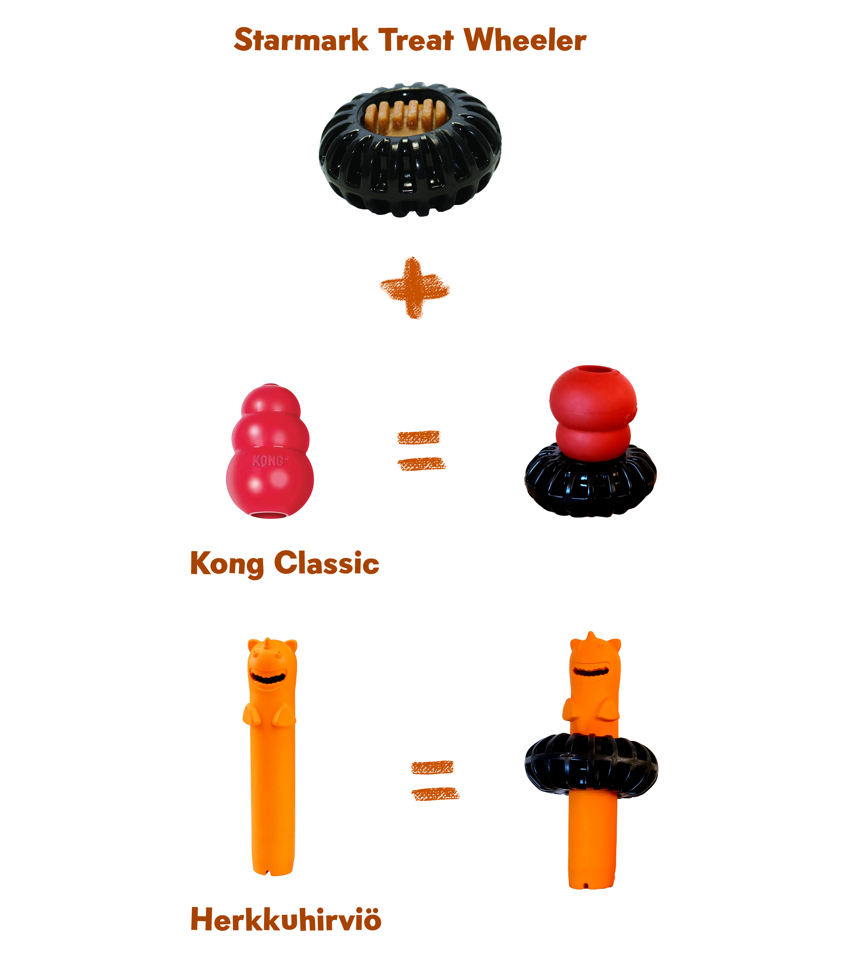 Starmarkilta löytyy paljon kestäviä aktivointileluja. Wheelerin voi täyttää joko siihen suunnitellulla purukeksillä. Voit täyttää Wheelerin välit pehmeällä ruoalla tai pienellä määrällä maapähkinävoita. Voit myös käyttää muovikippoa muottina ja pakastaa Wheelerin sisään ruokaa. Jakinmaitojuustotikusta voit mikrottaa Wheelerin sisään rapsakan juustokohokkaan koiralle.