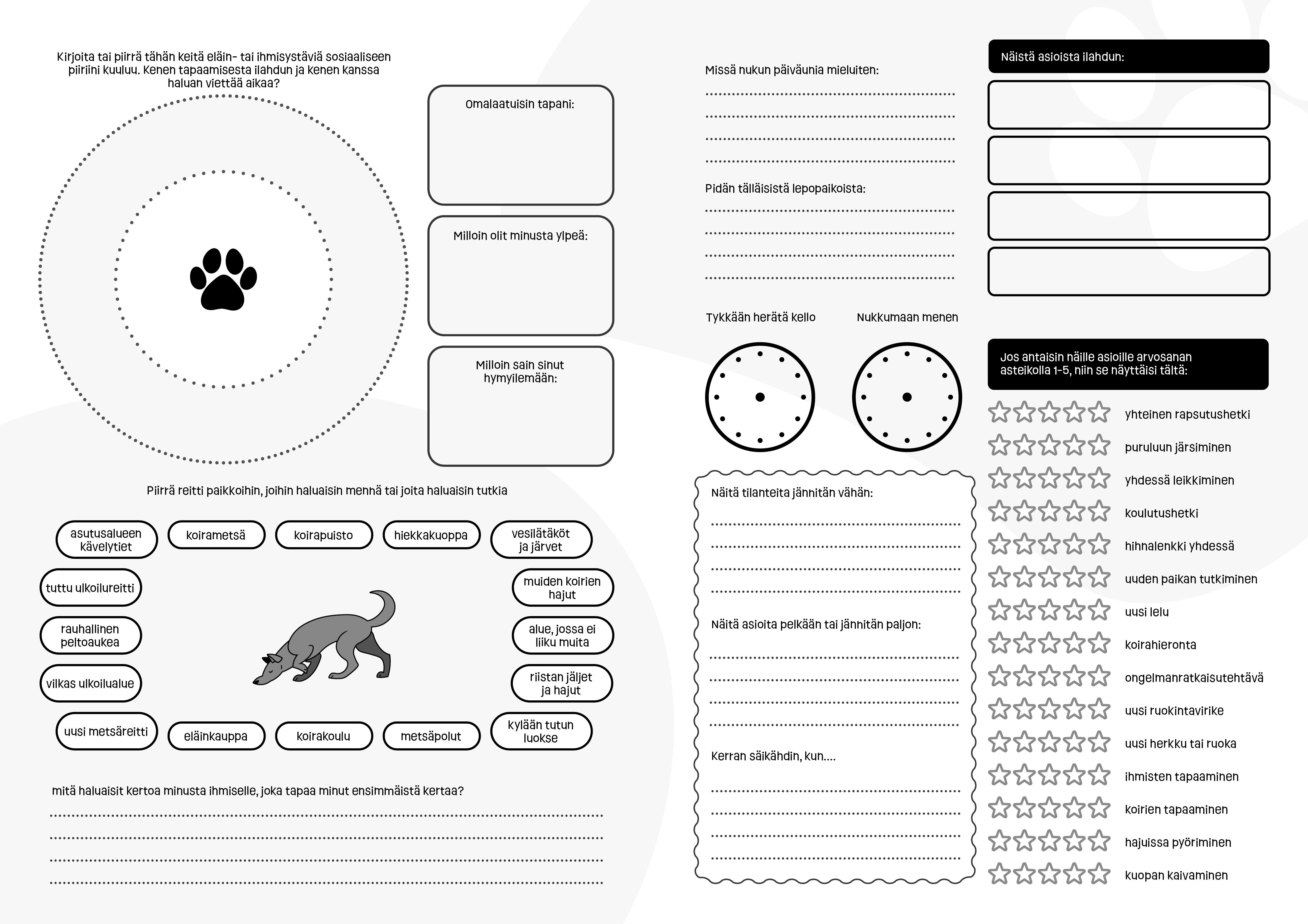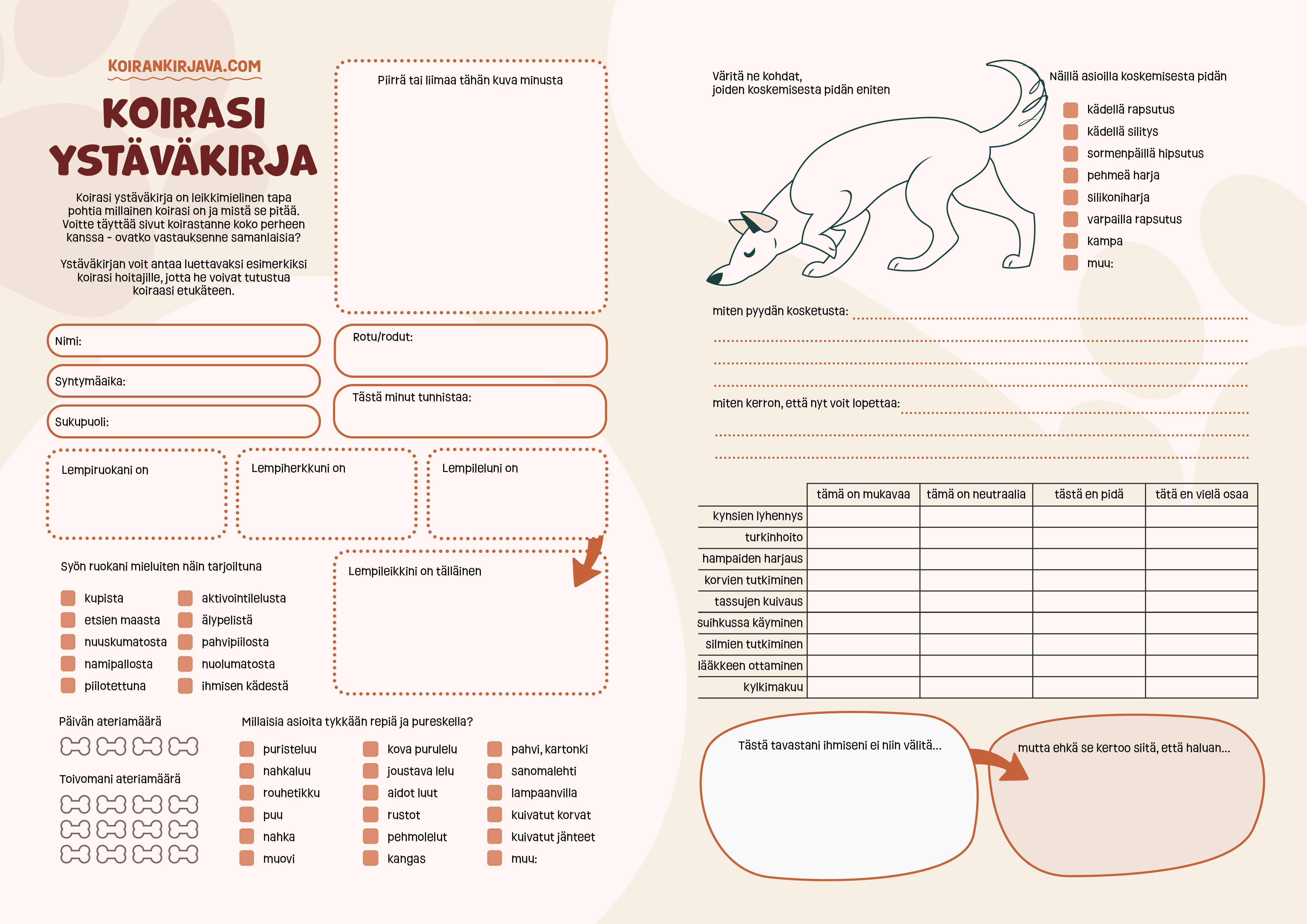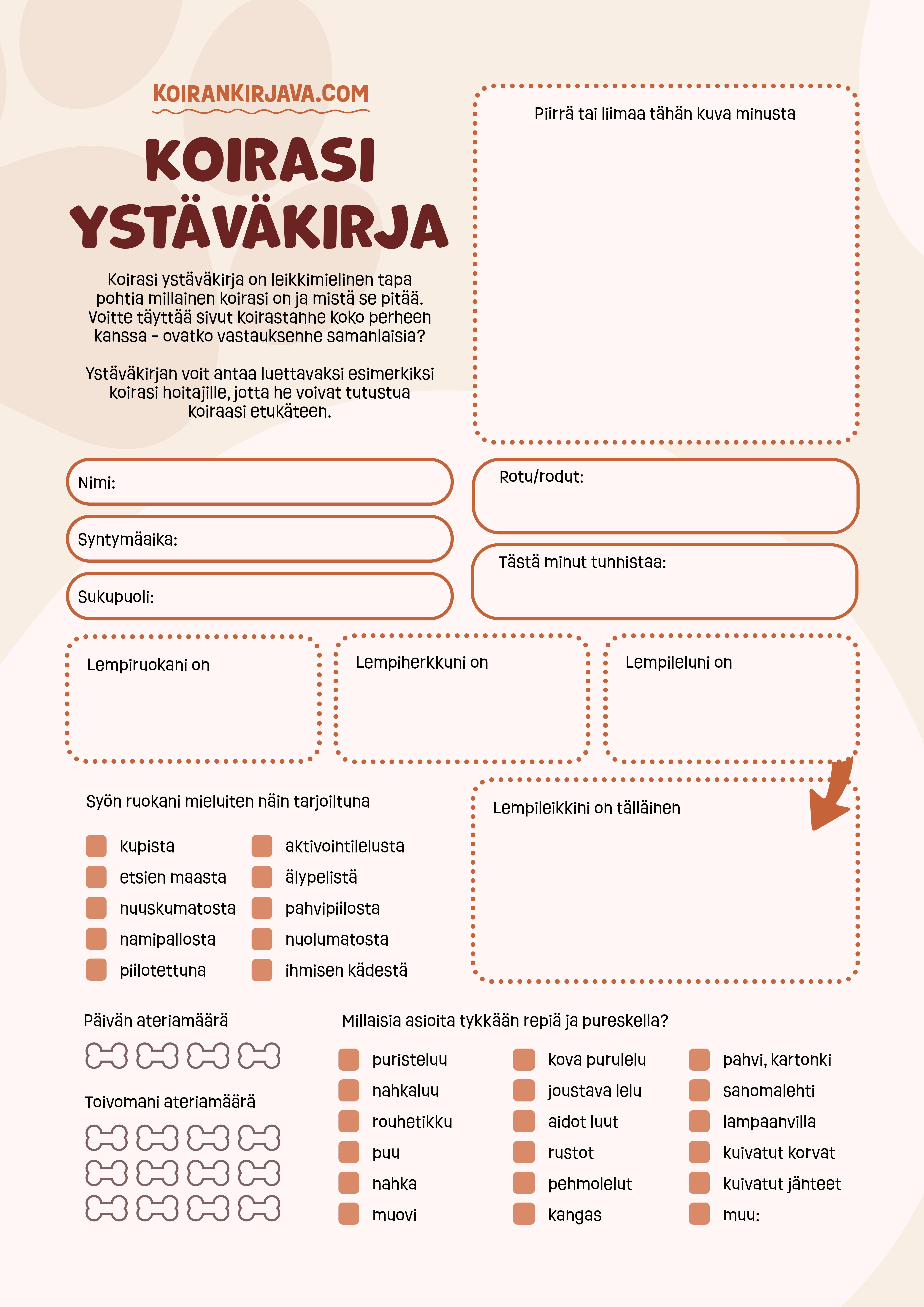 Ystäväkirjan voit antaa tutustuttavaksi ihmiselle, joka on koirasi kanssa paljon tekemisissä. Se voi auttaa esimerkiksi koirasi hoitajaa tutustumaan koiraasi.