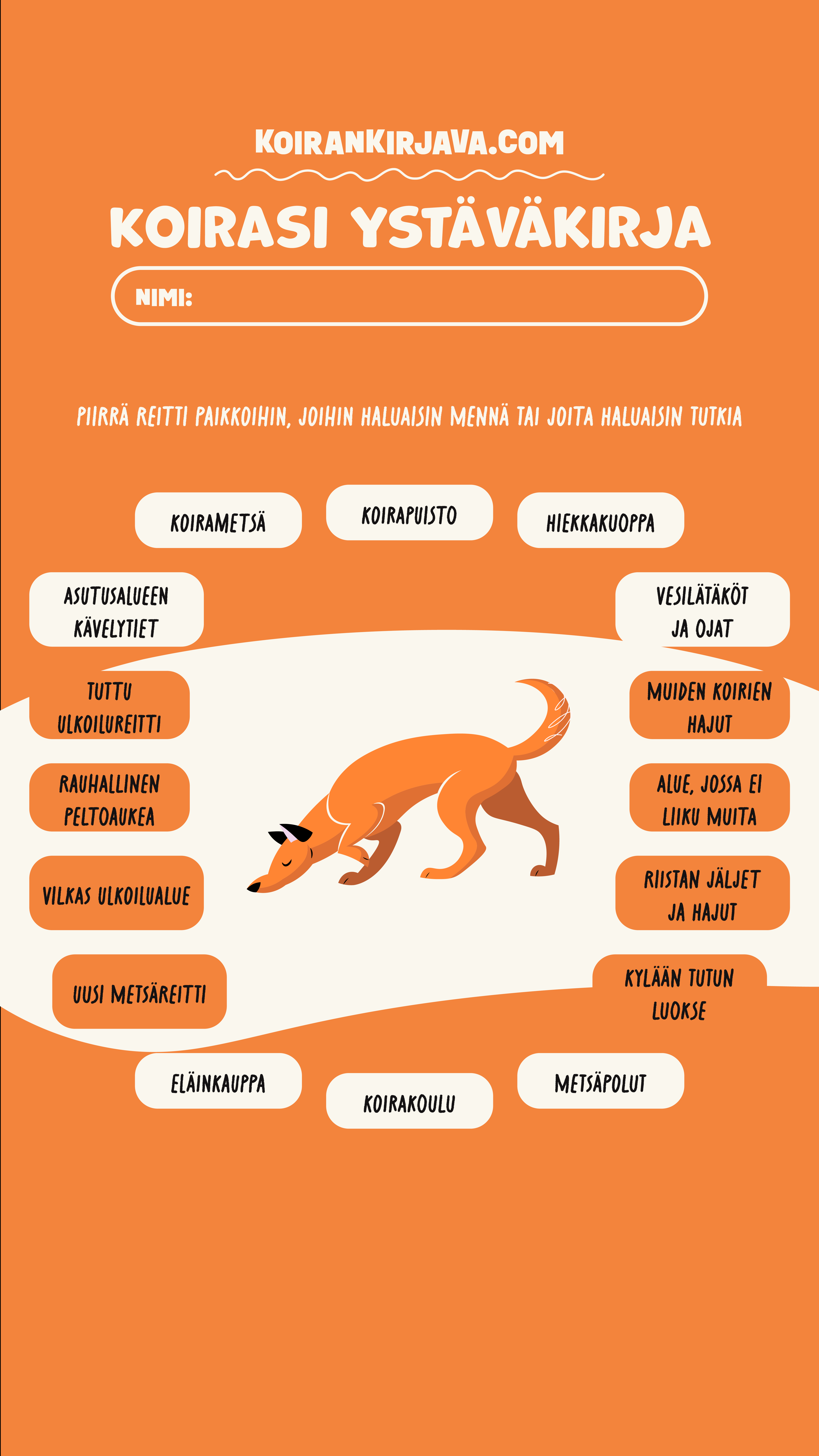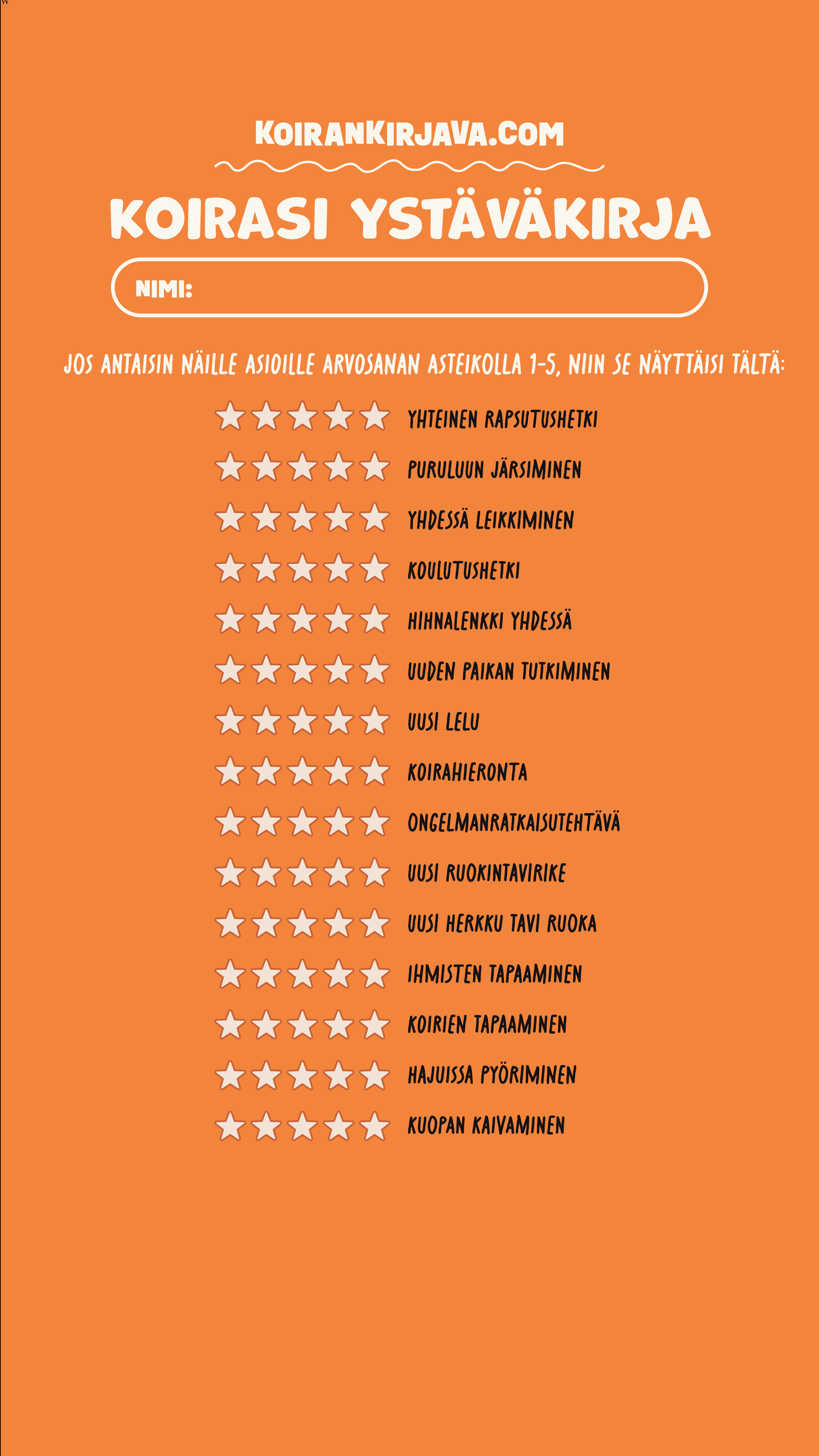 Lataa ja tulosta alta koiran ystäväkirja. Vaihtoehtoina on värillinen sekä harmaasävyinen tiedosto, joista voit tulostaa itsellesi joko kahden sivun aukeamat tai A4 kokoiset sivut. Lopusta löydät myös instagram-storypohjat, joihin on valittu ystäväkirjasta yksittäisiä kohtia. Lataa storypohja kännykällesi ja täytä instagramissa. Muista tägätä @koirankirjava mukaan!