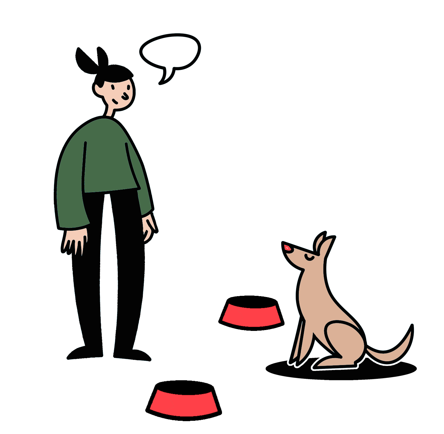 ”oikea” – asetan koiran oikealle puolelle vati tai kuppi, johon heität namin.