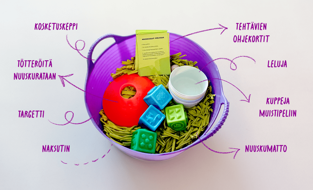 Tähän Taitopakkiin tarvitset kosketuskepin, merkkikartioita, vadin ja koiran herkkuja. Lisäksi mukaan voi laittaa nuuskulelun.