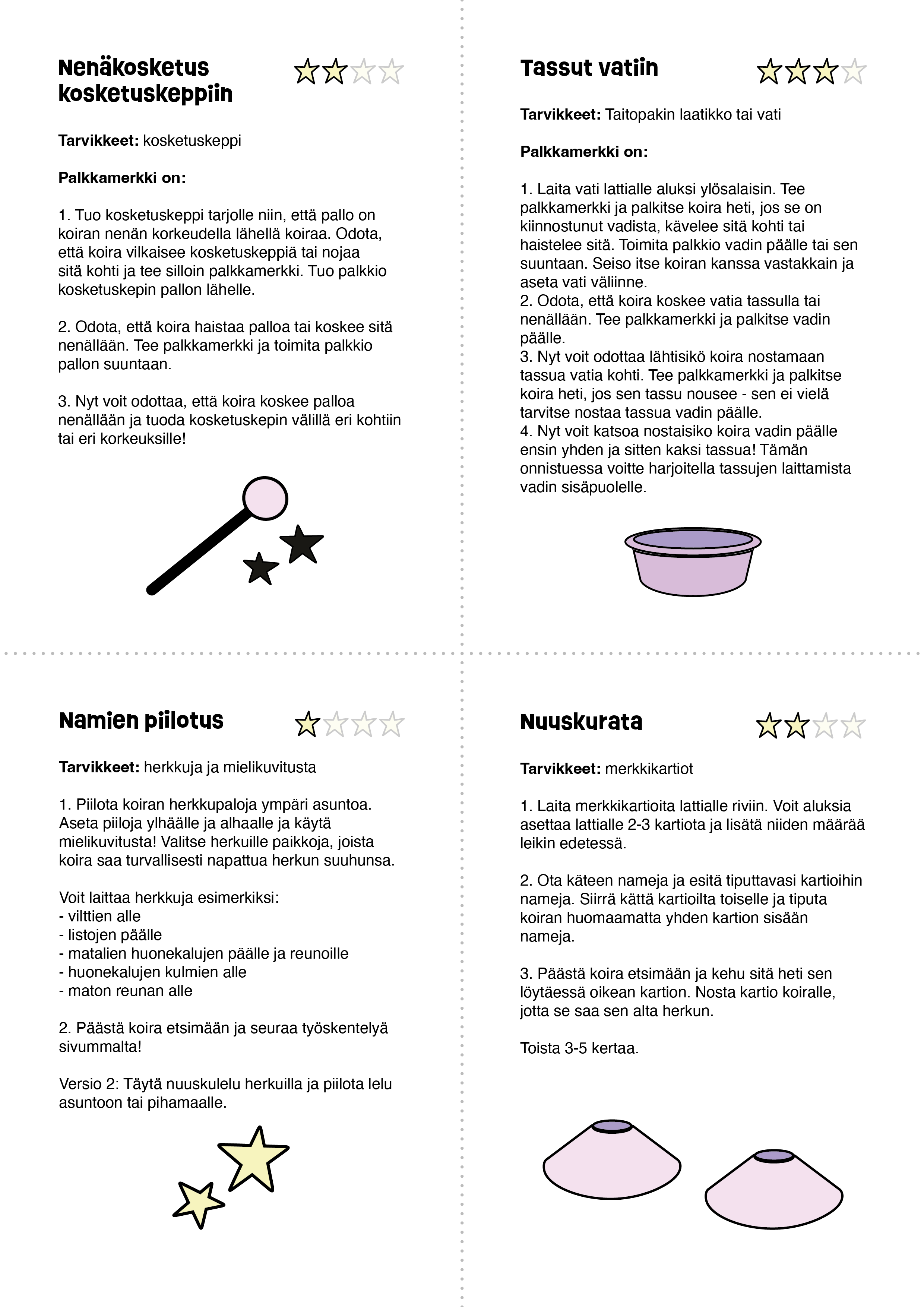 Julkaisen tammikuussa virikeideapankkiin (osa virikesuunnitelma palvelua) valikoiman erilaisia valmiita tehtäväkortteja sekä erilaisten vaikeustasojen Taitopakkeja, joita voit rakentaa itsellesi, perheellesi ja koirasi hoitajille. Taitopakin ideoista ja tehtäväkorteista on tulossa myös erillinen e-kirja.