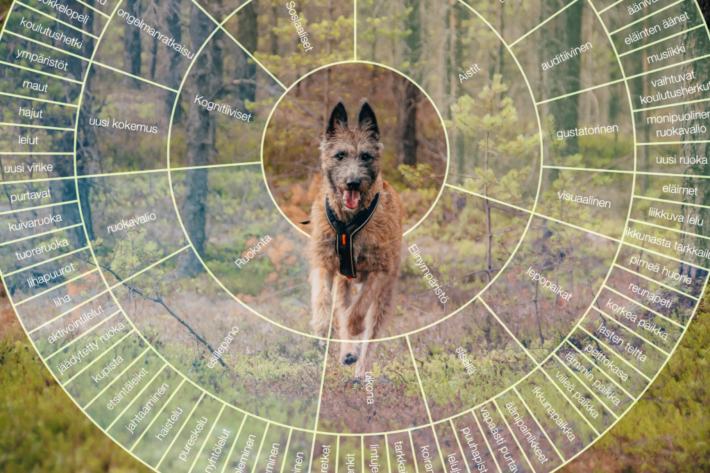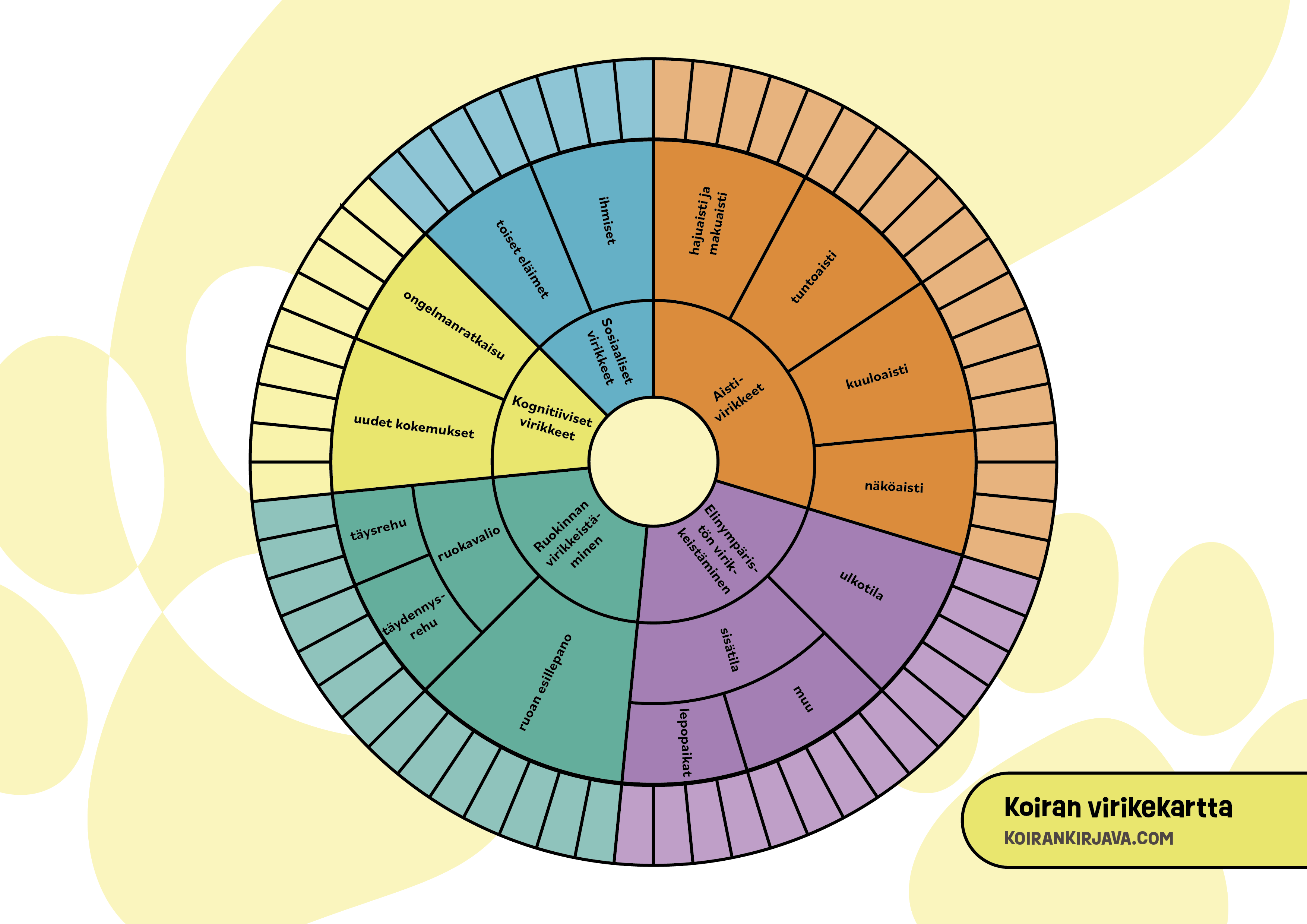 Tekemällä koirallesi virikekartan voit tarkastella virikkeistämisen monipuolisuutta. Kaipaako jokin kartan osa täydennystä tai onko jokin osa-alue niin monipuolinen, että se tuli helposti täyteen?