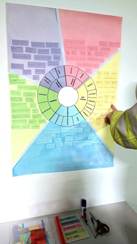 Aloitimme koirakoululla ryhmieni kanssa tälläisen suuren virikekartan kokoamisen. Kartasta voi saada uusia virikeideoita ja niitä voi jakaa muille, mutta ennen kaikkea se kuvaa virikkeistämisen monimuotoisuutta. Tätä kirjoittaessani kartta onkin jo lähes reunojaan myöten täynnä!
