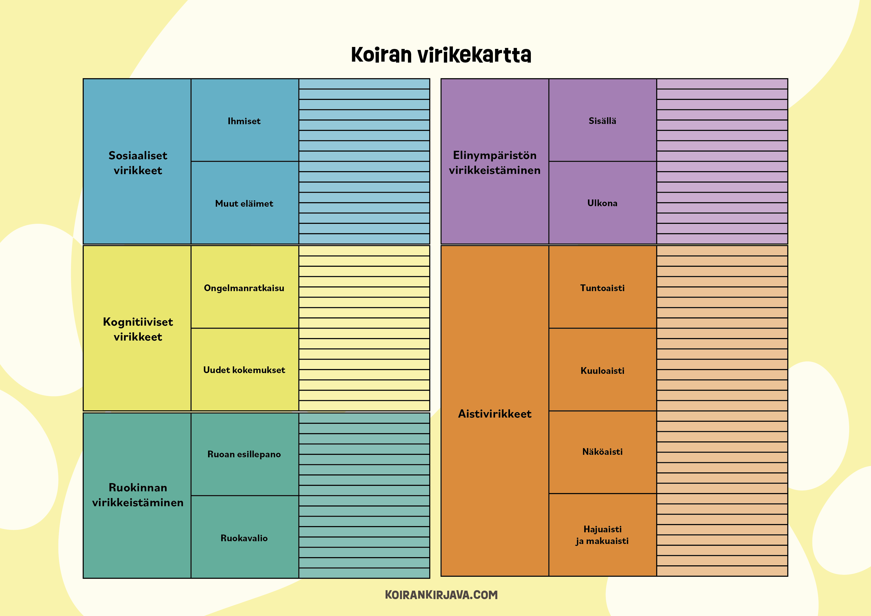 Virikekartan avulla voit hahmottaa virikkeistämisen monipuolisuutta ja arvioida kaipaisiko jokin osa-alue kenties enemmän huomiota. Voit kirjata itsellesi jokaisen virikekategorian alle erilaisia ajatuksia, miten mikäkin osa-alue tulee koirasi elämässä huomioiduksi.