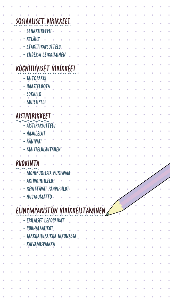 Voit tarkastella virikkeistämistä tai nykyistä virikesuunnitelmaanne monin eri tavoin. Tärkeintä on, että pohdit mitä teette paljon ja mitkä asiat ovat ehkä jääneet vähemmälle huomiolle. Mitä voisit lisätä tai pitäisikö jotain vähentää?