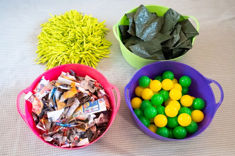 Nuuskuvadin voit tehdä esimerkiksi pesuvatiin, pyykkikoriin tai laatikkoon. Kuvassa nuuskuvadit on tehty joustaviin hevosten ruokintavateihin. Täytä nuuskuvati koirallesi sopivalla materiaalilla, kuten sanomalehtisilpulla, pallomeripalloilla, pressun tai pyyhkeen paloilla tai nuuskumatolla. Ripottele reilusti ruokaa sekaan!