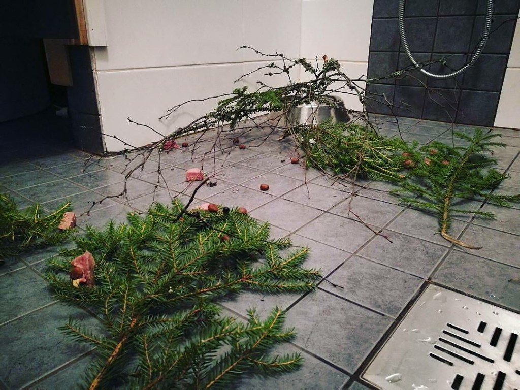 Normaalista poikkeavien tai uusien asioiden tuominen piristää nuuskutteluhetkeä sisällä ja tarjoaa koiralle myös aistivirikkeitä. Voit levittää lattialle pressun ja tuoda sisälle oksia, lehtiä, käpyjä tai muuta ”ulos kuuluvaa” materiaalia. Kuva on vuodelta 2017, kun pakkaspäivänä järjestin koirien ruokintahetken kylpyhuoneeseen.