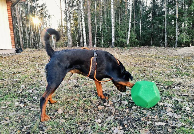 Kulmikkaan muotoiset ja joustavaa materiaalia olevat aktivointilelut ovat hyvä vaihtoehto villisti pyörivät namipallon sijaan. Kulmikas lelu ei pyöri yhtä herkästi koiraa karkuun tai sohvan alle ja koira saa pyöritellä ja keikutella lelua hieman keskittyneempi… tyylistään riippuen!